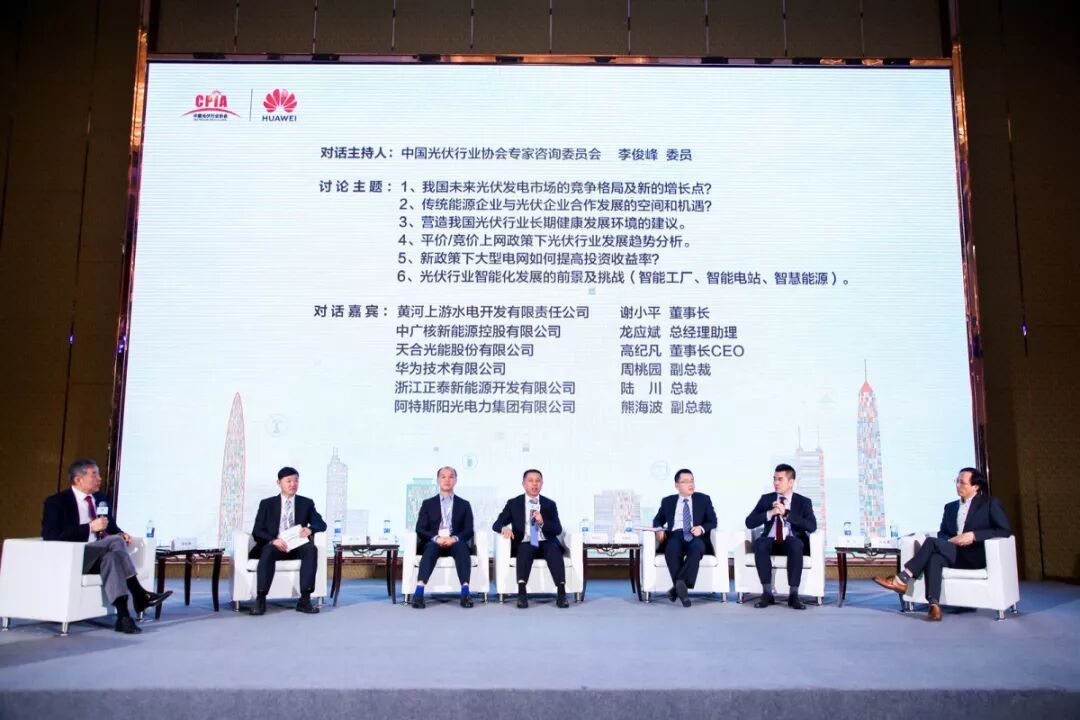 在由中國光伏行業協會專家咨詢委員會李俊峰委員主持的光伏領袖對話環節,黃河上游水電開發有限責任公司董事長謝小平、中廣核新能源控股有限公司總經理助理龍應斌、天合光能股份有限公司董事長兼CEO高紀凡、華為技術有限公司副總裁周桃園、浙江正泰新能源開發有限公司總裁陸川、阿特斯陽光電力集團有限公司副總裁熊海波等7位行業意見領袖也從當前行業挑戰、市場競爭等方面發表了各自的見解。